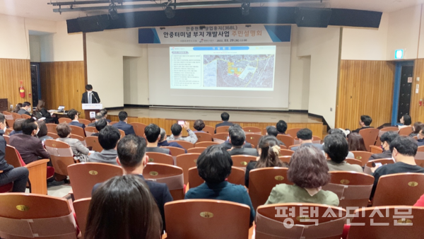평택도시공사는 3월 29일 서부문예회관 소공연장에서 안중터미널 개발사업 관련 주민설명회를 열고 개발 컨셉 등에 관해 알리고 주민 의견을 청취했다.
