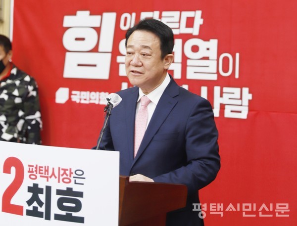 제20대 대통령직 인수위원회 상임자문위원을 맡은 최호 국민의힘 평택시장 예비후보가 4월 4일 평택시의회 3층 간담회장에서 기자회견을 열고 출마를 공식 선언했다.