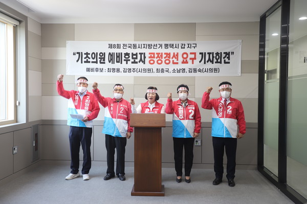 오는 6.1지방선거에서 국민의힘 평택시갑 가~라선거구 기초의원 공천에 배제된 예비후보자 5명이 5월 4일 평택시의회에서 ‘기초의원 예비후보자 공정 경선’을 요구하는 기자회견을 열고 강하게 반발했다.