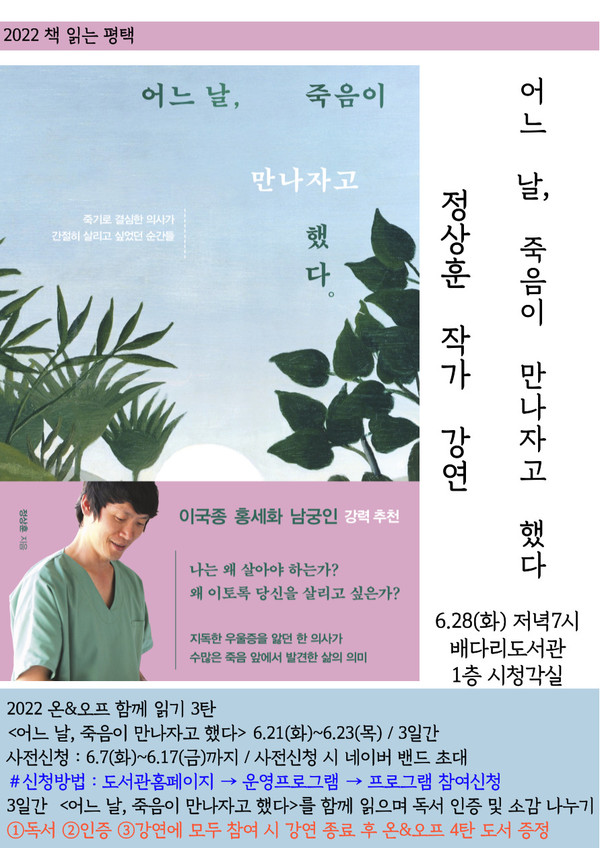 2022년 평택시 시민독서운동 ‘책 읽는 평택’ 사업의 세 번째 저자 강연이 배다리 도서관에서 6월 28일(화) 저녁 7시에 열린다.