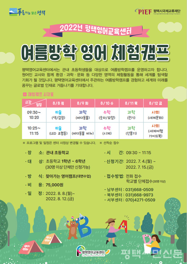 평택영어교육센터가 초등학생을 대상으로 여름방학 캠프를 추진할 예정이다.