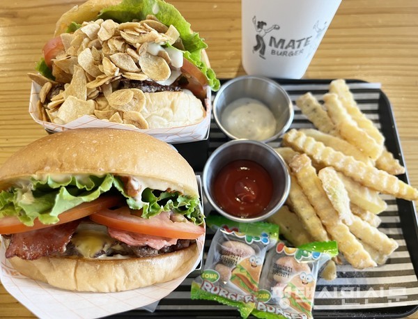 이곳의 시그니처 버거는 ‘메이트버거’다. 메이트버거에는 상추, 토마토, 양파, 치즈, 베이컨, 특제소스, 패티가 들어있다. 주문 즉시 버거가 조리되어 따뜻하고 부드러운 번을 맛볼 수 있다. 또한 갓 구운 소고기 패티의 육즙과 야채에서 나오는 적당한 수분, 샛노란 치즈, 새콤달콤한 소스가 어우러져 입 안에 풍미가 가득해진다. 메이트버거의 소스는 토마토랠리쉬로 심 사장이 매일 직접 만들어 다른 버거집과 다르게 싱그럽고 달콤한 맛이 난다.