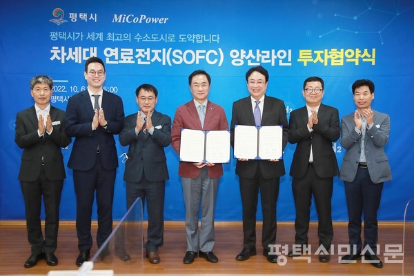 평택시는 10월 6일 ㈜미코파워와 수소산업의 핵심인 차세대 수소연료전지(SOFC) 양산라인 투자협약을 체결했다고 밝혔다. 평택시청에서 열린 협약식에는 정장선 시장과 ㈜미코파워 하태형 대표가 참석하여 1000억 원 규모의 투자를 통해 고용창출과 수소산업 육성에 공동 노력하기로 했다.