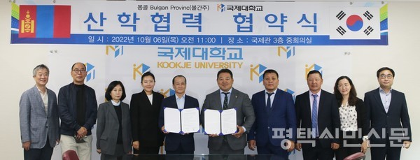 국제대학교는 10월 6일 대학 국제관에서 몽골 볼간주(Bulgan Provice)와 산학협력 협약을 체결했다. 이날 협약식에는 볼간주 아리운에르덴(B.Ariunerdene) 주지사, 국제대 임지원 총장 직무대리, 대한삼보연맹 이찬영 사무총장 등이 참석했다. 협약에 따라 국제대와 볼간주는 공동 홍보 브랜드 창출, 문화·학술 정보 교류, 학생 교류 등에 협력하고 교류 활성화에 적극적으로 노력하기로 했다.
