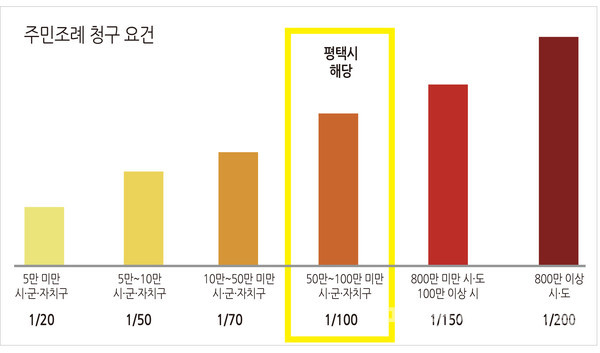 여기서 잠깐, 우리가 처음 준비했던 주민조례발안제도가 무엇인지 설명드릴까 합니다. 주민이 직접 조례를 만들어 청구하는 것을 주민조례발안이라 합니다. 청구권자는 18세이상(선거권자) 이상의 주민이어야 하고 일정 수의 서명을 받으면 됩니다. 서명수는 법률에 인구규모별 6단계로 세분화되어 있는데<표 1> 평택시는 인구가 50만이 넘으니 청구권자 총수 100분의 1 이상 서명을 받으면 됩니다. 서명은 수기기명도 가능하고 전자서명도 가능합니다. 전자서명은 행정안전부의 ‘주민e직접’(juminegov.go.kr)로 접속한 후에, 주민조례청구에서 서명하면 됩니다. 주민발안조례를 통해 조례가 만들어진 대표적인 사례는 ‘학교 무상급식 조례’ ‘대학생 학자금 지원 및 운용 조례’가 있고 가까운 안성에서도 현재 주민이 직접 청구한 조례가 진행 중에 있습니다. 주민발안조례 과정은 평택시의회 차원에서도 처음이라 우리가 문의했을 당시에는 필요한 절차와 과정을 숙지 못한 상태였고 시의회 홈페이지에도 세부적인 절차 안내가 없습니다. 주민조례발안 절차와 과정 등 자세한 내용은 행정안전부의 ‘주민e직접’ 사이트에 접속하면 안내를 받을 수 있습니다.<표 2>