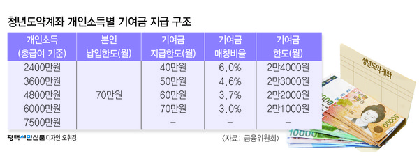 기본적인 상품 구조는 최대 납입액이 70만원인 5년 만기 적금이다. 여기에 정부가 매달 2만2000~2만4000원을 기여금 형태로 보태주고 이자소득에 비과세 혜택을 부여한다.