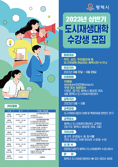 이번 도시재생대학은 5월 4일부터 6월 22일까지 매주 목요일 오후 7~9시 평택시 도시재생지원센터(중앙로 264 3층)에서 진행된다. 교육 과정은 도시재생대학의 이해, 도시재생 사례 분석, 특화재생·컨텐츠연구, 마을관리 경제조직의 이해 등으로 구성됐으며 전체 강좌의 70% 이상 수강자에게 수료증을 수여한다.