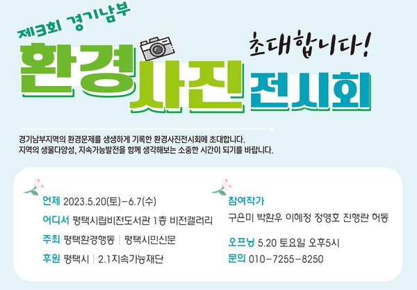 평택환경행동과 평택시민신문은 ‘제3회 경기남부 환경사진 전시회’를 오는 5월 20일부터 6월 5일까지 평택시립비전도서관 1층 비전갤러리에서 개최한다. 오후 5시에는 전시회 오프닝 행사가 열린다.
