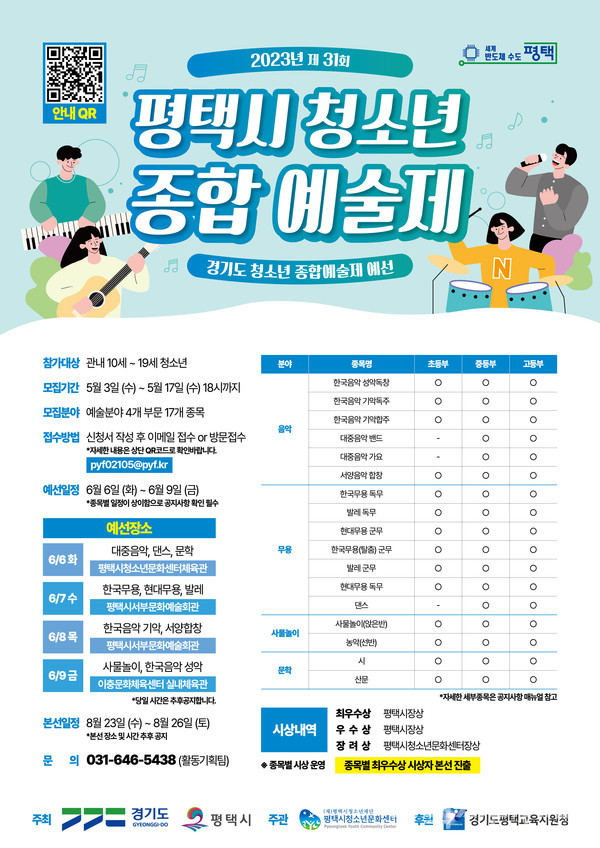 평택시청소년문화센터는 청소년의 예술적 성장을 도모하고 재능과 끼를 표출할 수 있는 ‘제31회 경기도청소년종합예술제 평택시 예선’ 참가자를 5월 17일까지 모집한다.