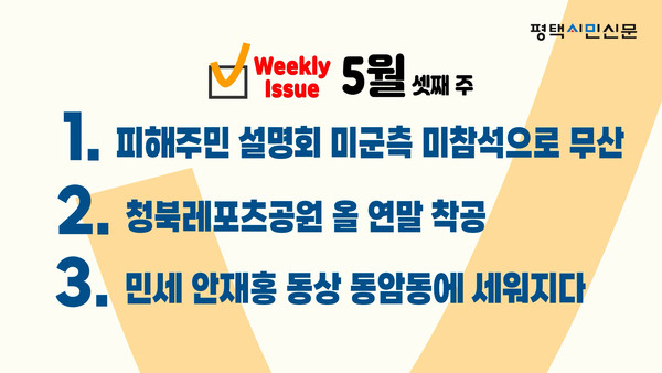 ▼▼ 아래 링크를 통해 영상을 시청하실 수 있습니다. https://youtu.be/cnO_HzE1k-s 관련기사 주민설명회에서 말도 없이 가버린 미군 민세 안재홍 동상 돈암동에 세워지다 청북레포츠공원 올 연말 착공 키워드 ##위클리이슈 #주간뉴스 평택시민신문 webmaster@pttimes.com 다른기사 보기 저작권자 © 평택시민신문 무단전재 및 재배포 금지 당신만 안 본 뉴스 한화이글스 간 라온고 하동준 “벅찬 기쁨과 책임감 느껴” 국힘 조강특위, 평택을 등 ‘사고당협’ 지원자 면접 [기획] 녹조와 심각한 수질 오염에 신음하는 평택호에 바닷물을… 21일 ‘일상 속의 예술, 예술 속의 일상’ 전시 개막 오색으로 물든 정원에서 느끼는 가을 정취 김현정, 굽네치킨 ‘정무수석 외압’ 의혹 제기 “중국 서해 구조물 문제를 혐중으로 왜곡 안 돼” 한화이글스 간 라온고 하동준 “벅찬 기쁨과 책임감 느껴” 댓글삭제 삭제한 댓글은 다시 복구할 수 없습니다. 그래도 삭제하시겠습니까? 비밀번호 닫기 기사 댓글 0 댓글 접기 댓글 내용입력 비회원 로그인 이름 비밀번호 댓글 내용입력 댓글쓰기 계정을 선택하시면 로그인·계정인증을 통해 댓글을 남기실 수 있습니다. 회원 로그인 비회원 글쓰기 이름 비밀번호 자동등록방지 로그인 옵션 창닫기 주요기사 예산 고갈로 산모신생아 건강관리 차질 우려 쿠팡 택배노동자 사망…평택지청에 특별감독 촉구 평택지역 도의원들 도의회 행감에서 활약 13년간 5만7400장, 한광중이 나른 ‘따뜻한 겨울’ 고덕10유치원·고덕1중학교 신설 평택항만공사, 95kW 규모 ‘햇빛발전소’ 조성