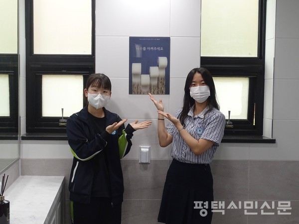 새로운 화장실에는 학생들이 지속가능한 환경지키기를 주제로 개최한 학생환경지킴이 공모전 수상작이 전시됐고 교직원들은 학생들에게 전하고 싶은 메시지를 화장실 담벼락에 새겼다.