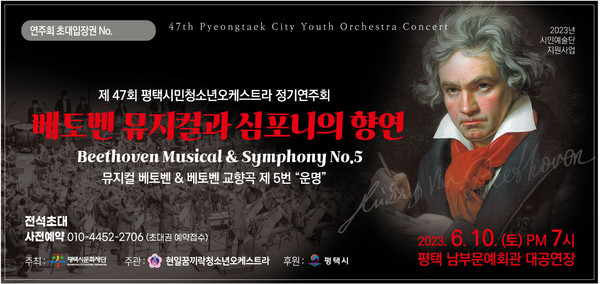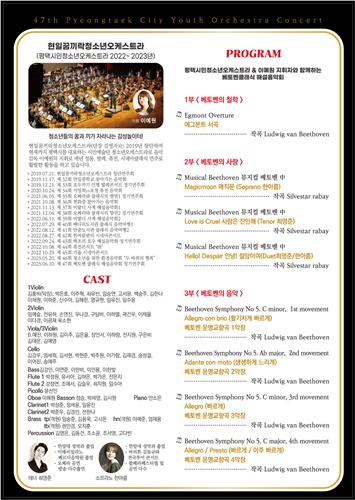 이번 정기연주회는 ‘베토벤 뮤지컬과 심포니의 향연’을 주제로 베토벤과 관련된 음악이 연주된다. 베토벤의 철학이 담긴 ‘에그먼트 서곡’, ‘뮤지컬 베토벤’, ‘운명’이라는 부제로 유명한 베토벤 교향곡 5번 전 악장을 감상할 수 있다. 이예원이 지휘하고 소프라노 한아름, 테너 최영준이 무대에 오른다.