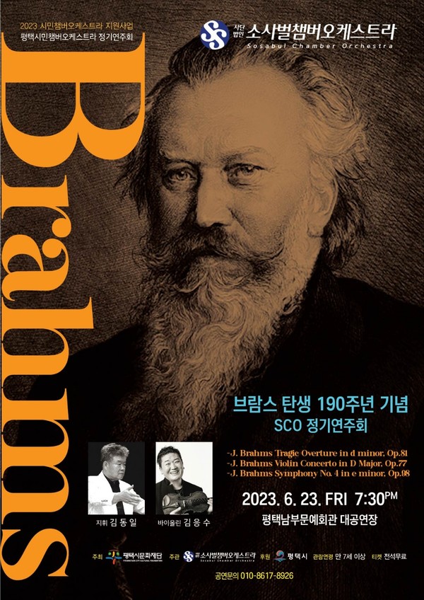 평택 출신 전문연주자들로 구성된 (사)소사벌챔버오케스트라와 국내 정상 연주자들이 힘을 모아 마련한 ‘브람스의 밤’이 그것으로 6월 23일 오후 7시 30분 평택남부문화예술회관에서 개최된다.