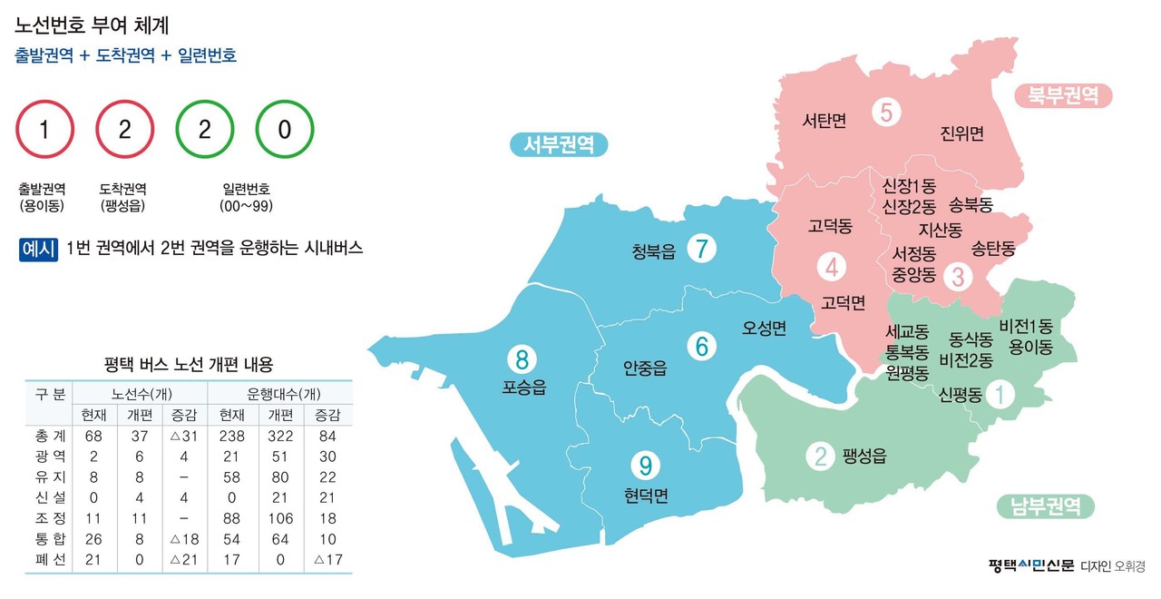 개편에 따라 현행 두 자릿수 버스번호가 출발권역·도착권역·일련번호로 이뤄진 네 자릿수로 바뀐다. 권역별 번호는 비전·원평·세교동 등 평택 남부와 안성시 등은 1번, 팽성읍은 2번, 송북·송탄·신장동 송탄 도심은 3번, 고덕은 4번, 서탄·진위면과 오산시는 5번, 안중읍과 오성면은 6번, 청북읍은 7번, 포승읍은 8번, 현덕면에는 9번이 각각 부여된다. 이에 따라 용이동부터 팽성읍을 오가는 기존 20번 버스는 ‘1220’로 번호가 바뀌게 된다.