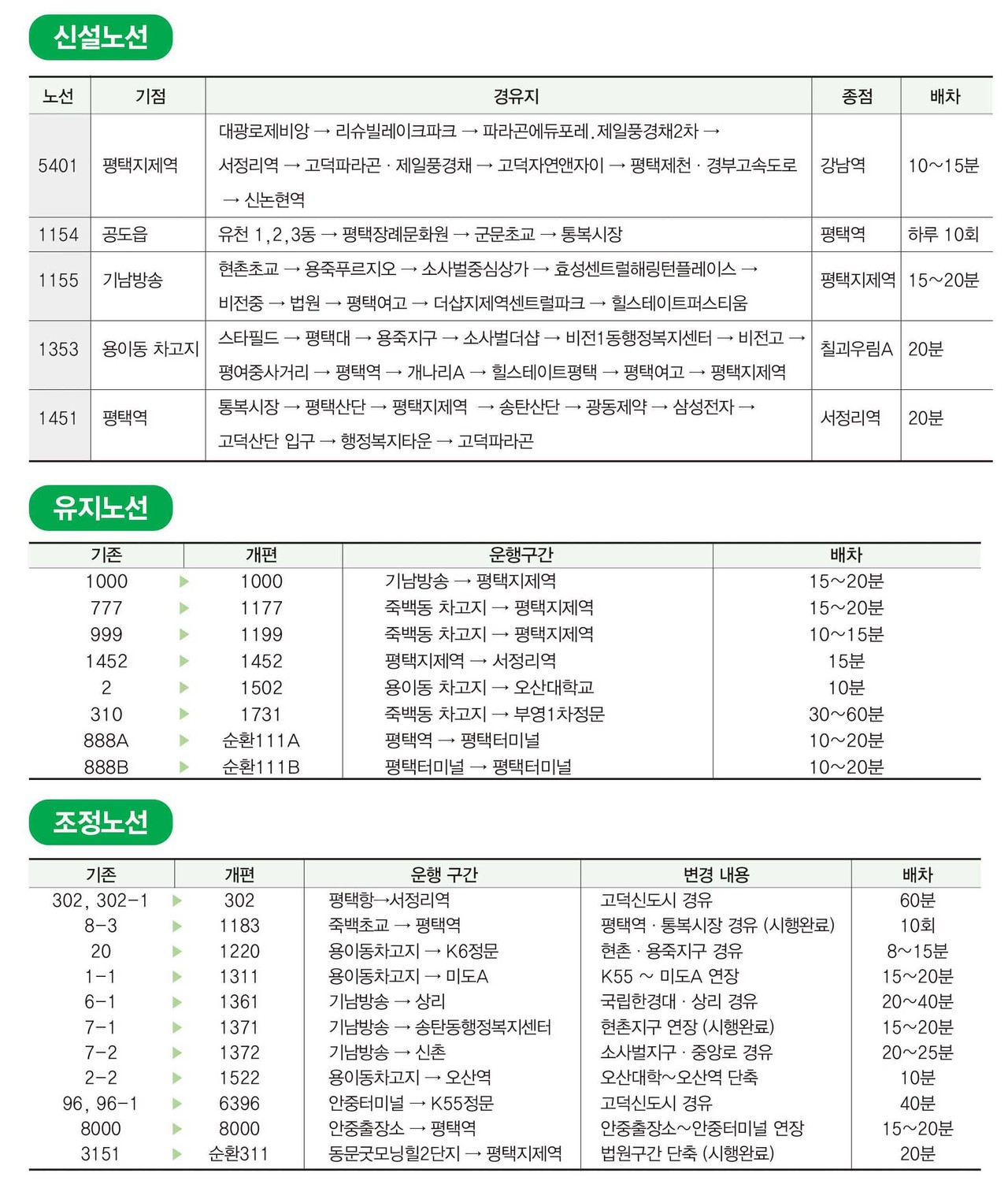 노선 변경 내용을 보면 철도역과의 환승 체계 강화에 중점을 뒀다. 신설 노선은 유천리와 평택역을 거쳐 통복시장을 다니는 1154번, 기남방송부터 평택지제역까지 운행하는 1155번, 소사벌지구와 지제역을 잇는 1353번, 서정리역에서 고덕국제신도시를 경유해 평택역으로 가는 1451번 등 모두 4개다. 302번, 1-1번, 20번, 6-1번, 7-1번 등 11개 노선이 조정되며 100번, 100-1번, 6번, 5번, 7-5·6·8번, 17번, 57번, 110번, 100-2번, 94번, 94-1번, 940번 등 14개 노선은 폐지된다.