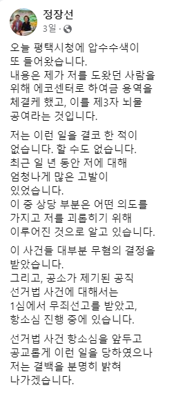 경찰이 정장선 평택시장의 제3자 뇌물수수 혐의에 대해 평택시청 압수수색을 벌인 가운데 정 시장은 자신의 사회관계망서비스(SNS)에 “결백을 분명히 밝힐 것”이라고 억울한 심경을 밝혔다.