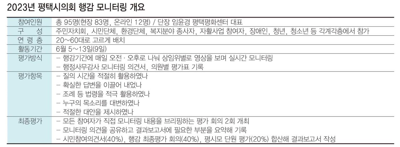 평택시민 시의회모니터링단(평시모)은 6월 5~13일 진행된 2023년 행정사무감사 모니터링 결과를 26일 발표했다.