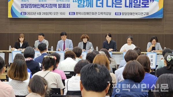 발달장애인 자녀를 둔 부모들을 중심으로 꾸려진 발달장애인복지연구회가 지난 1년간 조사하고 연구한 장애인정책을 제시하는 ‘정책발표회와 토크쇼’를 6월 29일 평택시장애인복지회관에서 개최했다. 이날 발표회에는 정장선 평택시장, 유승영 평택시의장, 연구위원, 시민 등 150여 명이 참석했다.