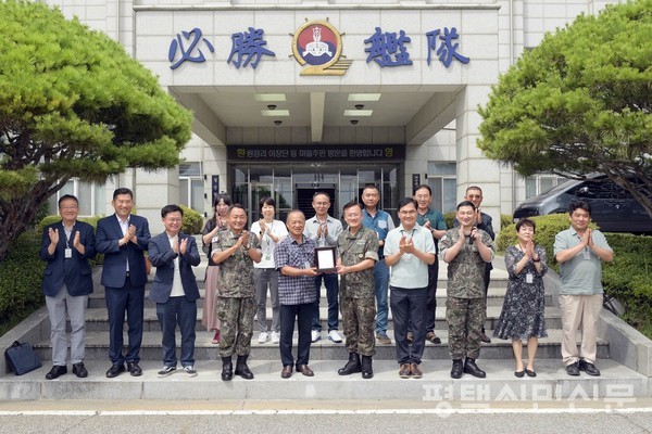 이날 감사패는 5월 13일 열린 제1회 평택해양페스티벌의 성공적 개최를 위해 노력한 해군2함대의 노력에 감사하는 마음이 담겼다. 전명수 운동본부 공동대표는 “해군의 민관군 상생과 협력으로 해양축제가 성공적으로 개최되었다”며 “앞으로도 더욱 큰 발전을 위해 함께 협업해 나가자”고 말했다.
