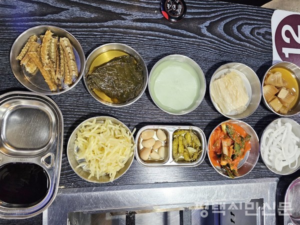 주방에서 초벌구이한 장어는 손님 테이블에서 다시 한번 천연 숯불 석쇠에 굽는다. 초벌을 했음에도 장어가 무척 크다. 가위로 잘라 석쇠에 일렬로 얹으니 이내 푸짐한 한 상이 차려진다. 장어가 지글지글 익어가는 동안 장어 맛을 돋우면서 기름진 장어의 느끼함을 덜 수 있는 밑반찬을 살펴보았다. 10여 가지가 차려진다. 생강채, 무쌈, 깻잎, 백김치, 양파절임, 대파절임 등 한 가지 한 가지가 깔끔하다. 노릇노릇 장어가 앞뒤로 잘 익었다. 장어 한 점을 집어 무쌈에 싸고, 한 점은 묵은지에 올리고, 또 한 점은 깻잎절임에 양파와 생강을 곁들여 먹었다. 한입에 넣기 힘들 정도로 고기가 크고 두툼하다. 육즙이 많고, 씹을수록 고소하다.