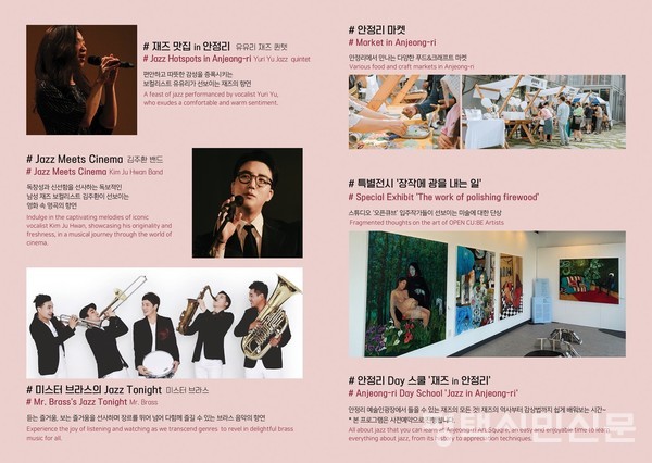 이번 행사는 감성을 노래하는 <유유리 재즈퀸텟>, 독보적인 남성 재즈보컬리스트 <김주환밴드>, 금관악기로 재즈를 연주하는 <미스터 브라스> 등 국내 최고의 재즈 뮤지션들이 다채로운 공연을 선보인다. 또한 재즈의 역사와 감상법을 쉽게 배워 볼 수 있는 인문학 강의 <재즈 In 안정리>, 안정리 지역상인들과 함께하는 <안정리 마켓>, 그리고 스튜디오 오픈큐브 입주작가들이 선보이는 특별전시로 구성됐다.