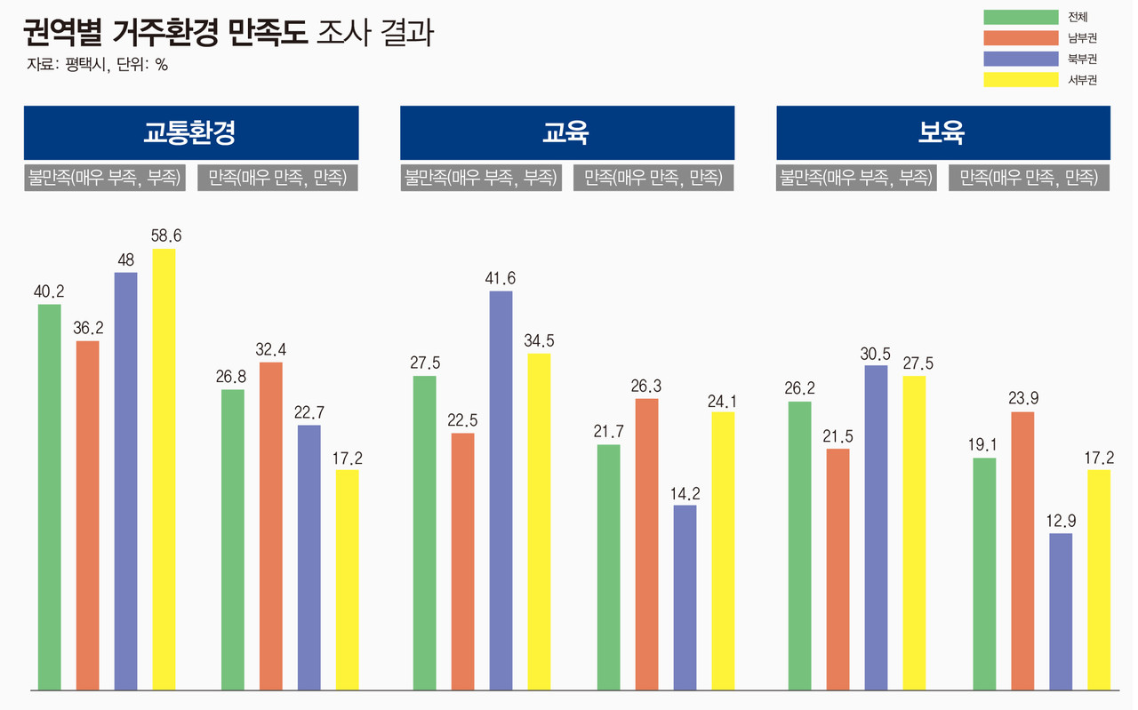거주환경 만족도를 조사한 결과 전반적으로 교통환경에 대한 만족도가 가장 낮았고 교육, 일자리, 보육 등의 순이었다. 서부권의 경우 다른 지역과 달리 교통환경에 이어 생활환경 만족도가 낮은 것으로 나타났다.