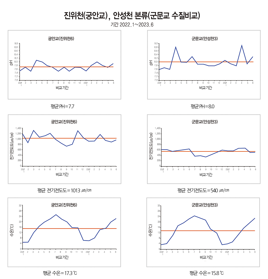 이 기간 동안 궁안교의 평균 PH 농도는 7.7, 군문교의 농도는 8.0이었고, 평균 전기전도도는 궁안교 1013㎲/cm(마이크로지멘스), 군문교 540㎲/cm로 나타났다. 평균수온은 궁안교 17.3℃, 군문교 15.8℃이다.<표참조>