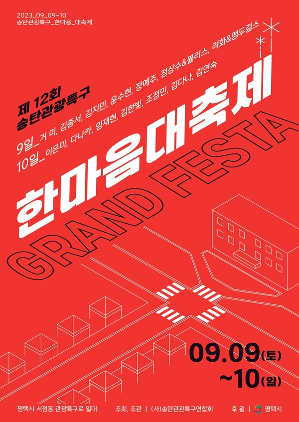사단법인 송탄관광특구연합회가 주최·주관하는 ‘송탄관광특구 한마음 대축제’가 9일과 10일 양일간 평택시 송탄출장소 앞 관광특구로 일대에서 개최됐다. 올해로 12회째를 맞는 이번 송탄관광특구 한마음 대축제는 축제장 내 사진 촬영 구역 조성, 경품추첨 등 이전보다 더욱 풍부한 즐길 거리를 제공했으며, 시민들과 관광객이 모두가 함께 즐길 수 있는 축제의 장으로 펼쳐졌다.