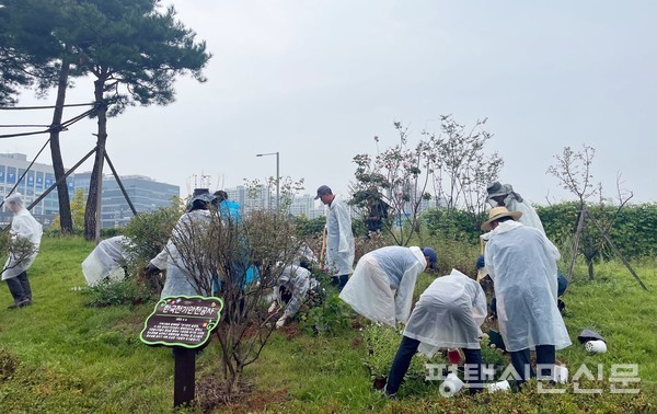 이날 행사는 지난 여름철 장마와 무더위로 일부 훼손된 전기안전 숲 정원을 지역주민들의 휴식 공간으로 다시 마련하기 위해 잡초 등을 제거하고 추명국, 가시쑥부쟁이 등 가을 화초 6종 150여본을 추가로 심어 새롭게 정비했다.