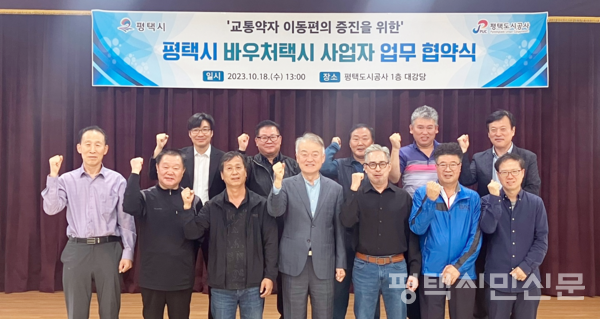 평택도시공사는 18일 강팔문 사장, 바우처택시 운송사업자 9명이 참석한 가운데 교통약자 바우처택시 운행협약을 체결하고 운행 준비를 마쳤다.