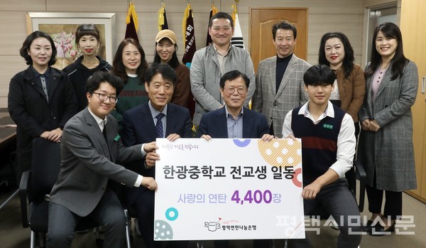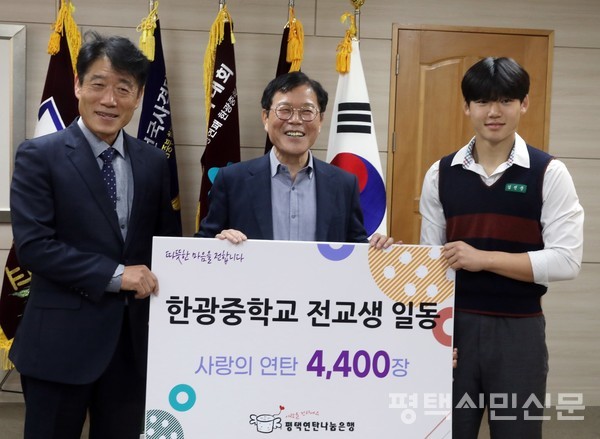 한광중학교는 10월 27일 교장실에서 평택연탄나눔은행에 사랑의 연탄 4400장을 전달했다. 사랑의 연탄은 교내에서 개최한 교복나눔장터와 사랑나눔 바자회 수익금으로 마련한 것이다.
