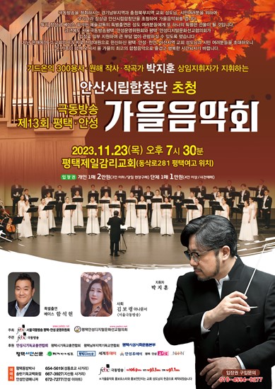 안산시립합창단 초청 제11회 평택·안성 가을음악회가 11월 23일 오후 7시 30분 평택여고 앞에 있는 평택제일감리교회에서 개최된다. 서울극동방송 평택·안성운영위원회와 평택·안성디지털문화선교협의회가 선사하는 이번 음악회에서 합창이 전하는 가을 정취와 서정을 만끽할 수 있다.