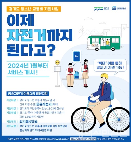 경기도와 경기교통공사는 내년 1월 3일부터 경기도 통합교통플랫폼 ‘똑타’ 앱을 통해 공유자전거 이용 및 결제 서비스를 시행하고, 경기도 청소년에게는 요금을 1000원 할인해주는 ‘청소년 공유자전거 이용요금 지원사업’을 추진한다고 12월 4일 밝혔다.