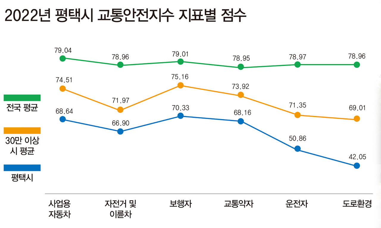 12월 6일 도로교통공단이 발표한 2022년 전국 지자체 교통안전지수를 보면 평택시는 E등급인 61.16점(100점 만점 기준)을 받았다. 이는 평택시가 속한 그룹인 인구 30만 이상 시 29개를 포함한 227개 지자체 중 최하위 점수이며 69.52점을 기록했던 2021년 교통안전지수 산출 결과보다 12.04% 하락한 결과다. 지난해 평택시는 D등급인 69.52점을 기록해 인구 30만 이상 시 29개 중 25위, 전국 227개 지자체 중 221위로 교통안전이 매우 낮다는 평가를 받았었다.