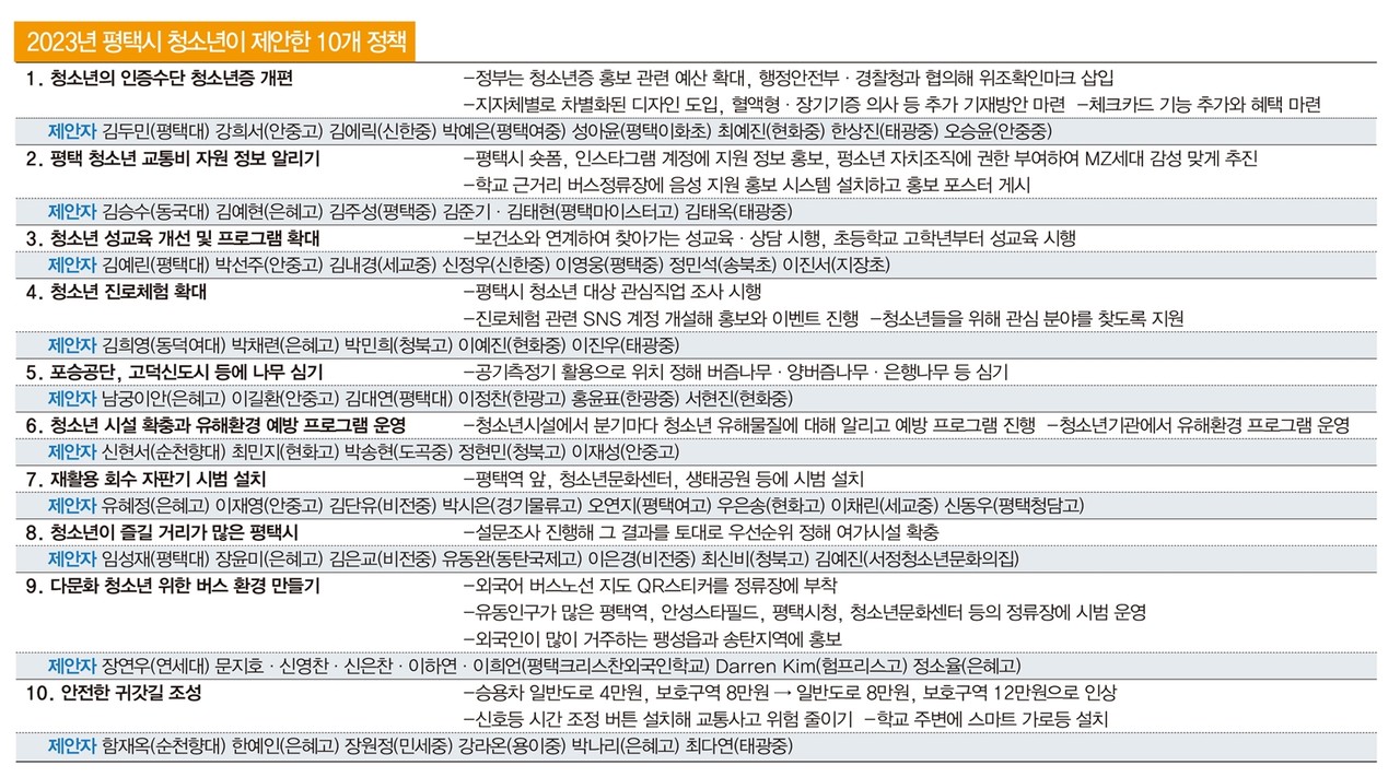 이날 제안한 10개 정책은 지난 11월 한 달간 청소년 50여 명이 10개 조로 나누어 분임 토의를 진행해 마련한 것으로 청소년증 개편, 청소년 진로체험 확대, 청소년 여가활동 시설 확충, 재활용 회수 자판기 시범 설치, 다문화 청소년 위한 버스 환경 만들기 등으로 이뤄졌다.