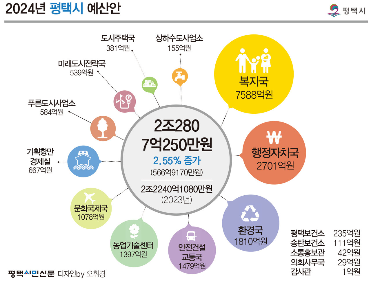평택시의 새해 예산이 2조2807억250만원으로 확정됐다. 이는 2023년 본예산 2조2240억1080만원보다 566억9170만원(2.55%) 증가한 규모다.