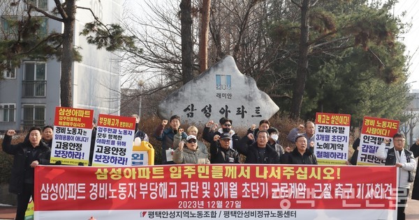 민주노총 민주일반연맹 평택안성지역노동조합(평택안성지역노조)과 평택비정규노동센터는 지난해 12월 27일 삼성아파트 정문 앞에서 기자회견을 열어 경비노동자 부당해고를 규탄하고 3개월 초단기 계약의 근절을 촉구했다.