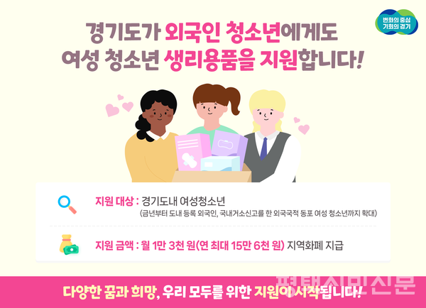 경기도가 올해부터 ‘여성청소년 생리용품 보편 지원 사업’ 지원 대상을 도내 외국인 청소년까지 확대 운영한다고 1월 9일 밝혔다.
