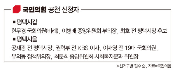 국민의힘 공천서류 접수 결과 평택갑에 3명, 평택을에 5명이 신청한 것으로 확인됐다.