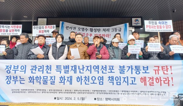 평택시민환경연대·서평택환경위원회·평택시발전협의회·평택시민지역경제살리기비상대책위원회 등은 2월 5일 평택시의회 앞에서 기자회견을 열어 정부의 관리천 특별재난지역 선포 불가 통보를 규탄했다. 이들 단체는 “관리천 독성 유해물질 오염사고는 초기대응 미흡, 소방당국의 부적절한 대처, 한강유역환경청의 인허가 과정 의혹 등 복합적인 인재”라며 “복구비용으로 1000억원이 소요될 것으로 전망되고 특정 기업과 지자체가 수습할 수 있는 차원을 넘어선 만큼 정부가 나서서 해결해야 한다”고 강조했다.