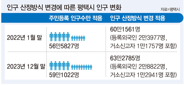 이에 따라 주민등록 인구는 2023년 12월 말 현재 59만1022명이지만 변경된 산정방식을 적용하면 평택시 인구는 등록외국인 2만8822명, 거소신고자 1만2941명이 추가돼 63만2785명으로 집계된다.