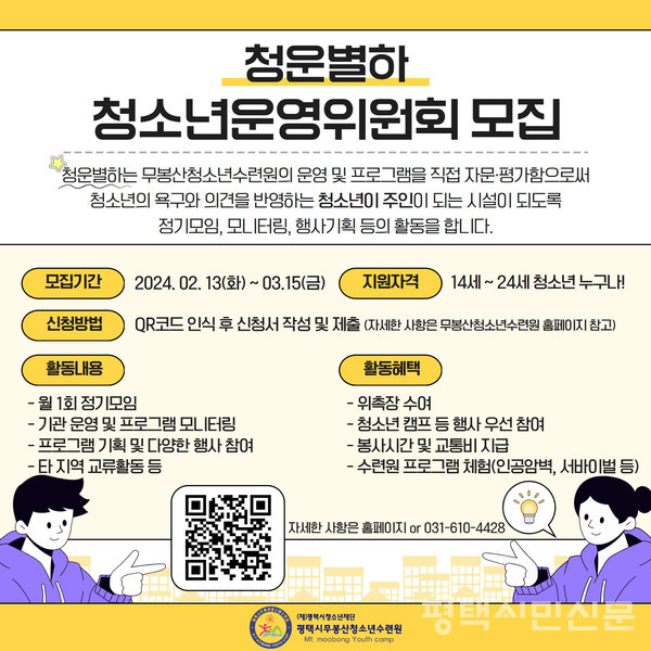 무봉산청소년수련원은 3월 15일까지 제6기 청소년운영위원회 ‘청운별하’ 위원을 모집한다.