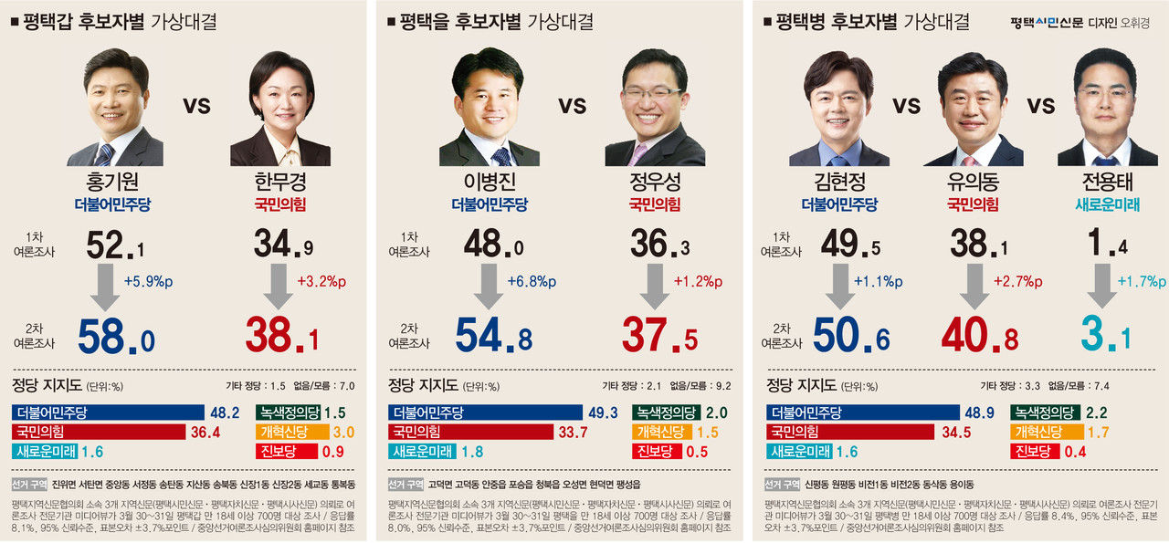 제22대 총선을 10여 일 앞두고 3월 30~31일 진행한 평택지역신문협의회 공동 2차 여론조사 결과 평택시갑‧을‧병 선거구 모두 더불어민주당 후보가 국민의힘 후보에서 오차범위 밖에서 앞서는 것으로 집계됐다. 지난 3월 16~17일 진행한 1차 여론조사와 비교해 더불어민주당 후보와 국민의힘 후보 간 격차는 좁혀지지 않고 있었다.