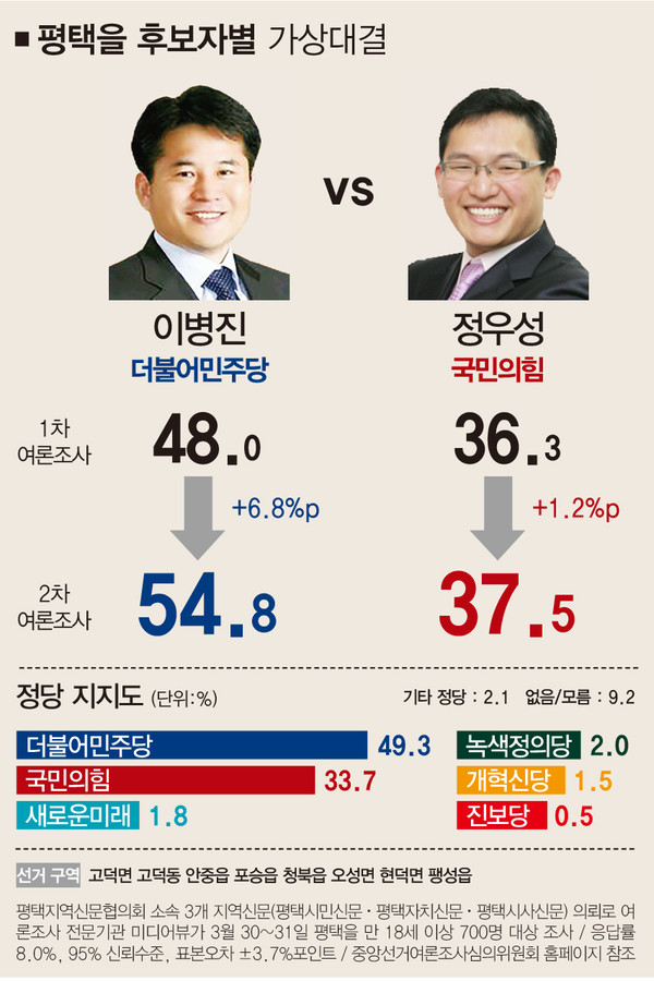 2차 조사는 1차와 마찬가지로 평택지역신문협의회 소속 3개 지역신문(평택시민신문‧평택자치신문‧평택시사신문)이 여론조사 전문기관인 리서치뷰에 의뢰해 갑‧을‧병 선거구 거주 18세 이상 유권자 각 700명을 대상으로 하고 ARS 휴대전화 조사방식으로 진행됐다. 표본오차는 95% 신뢰수준에 ±3.7%p이며 응답률은 갑 선거구 8.1%, 을 선거구 8.0%, 병선거구 8.4%다. 자세한 내용은 평택시민신문 홈페이지와 중앙선거여론조사심의위원회 홈페이지 등에서 확인할 수 있다.