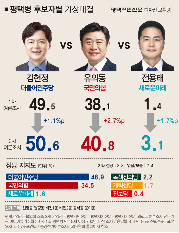 평택병 선거구에서 더불어민주당 김현정 후보는 50.6%의 지지를 얻어 40.8%에 그친 국민의힘 유의동 후보를 9.8%p 앞섰다. 새로운미래 전용태 후보는 3.1%의 지지를 얻었고 무응답은 5.5%였다.