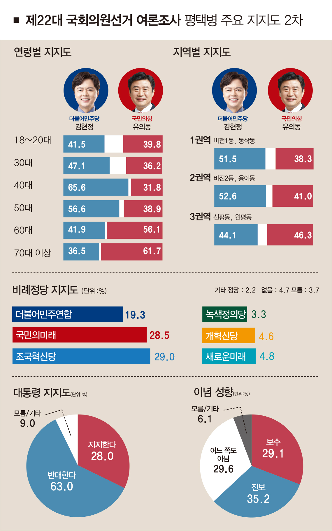 평택(병) 후보지지도는 민주당 김현정 후보가 50.6%의 지지를 얻어 40.8%에 그친 국민의힘 유의동 후보를 9.8%p 앞섰고, 새로운미래 전용태 후보는 3.1%의 지지를 얻었다(무응답 : 5.5%) 1차 조사 대비 김현정 후보는 1.1%p, 유의동 후보는 2.7%p, 전용태 후보는 1.7%p 동반 상승한 가운데 1~2위 격차(11.4%p → 9.8%p)는 다소 좁혀졌다.