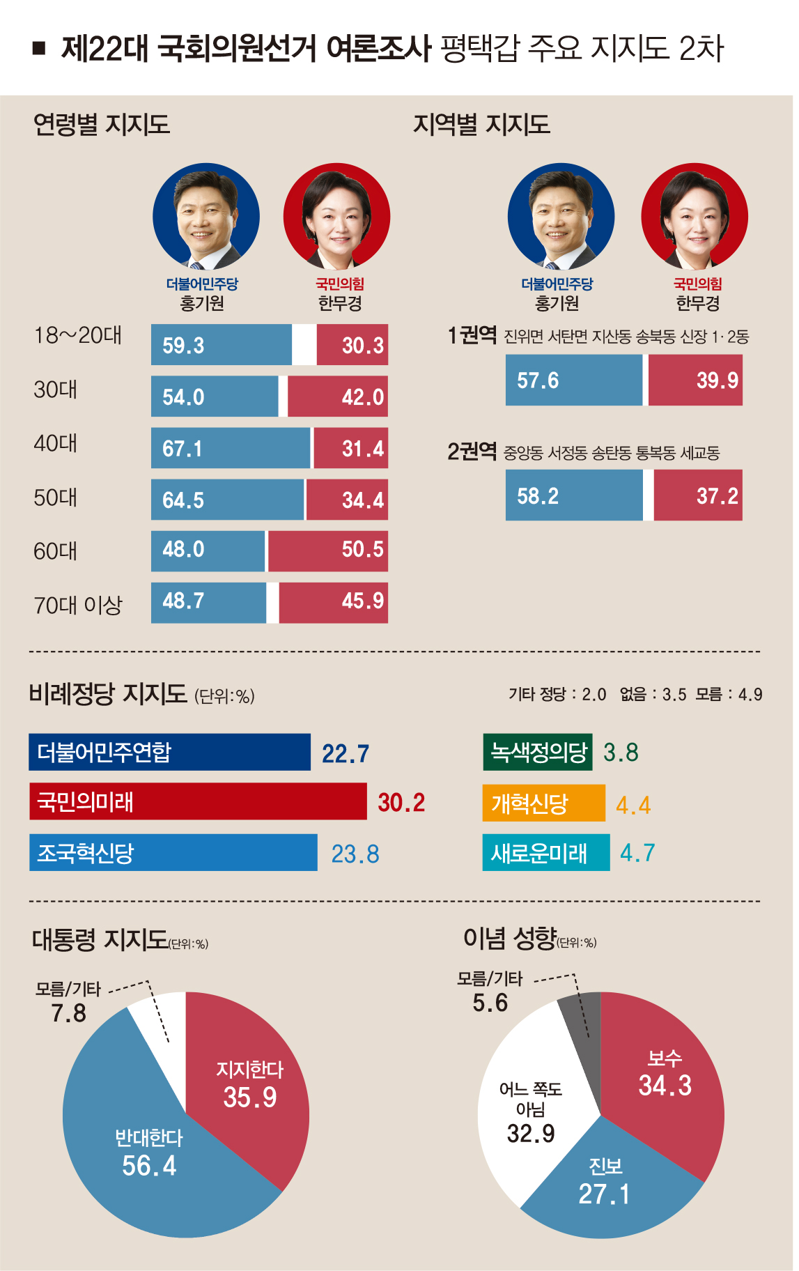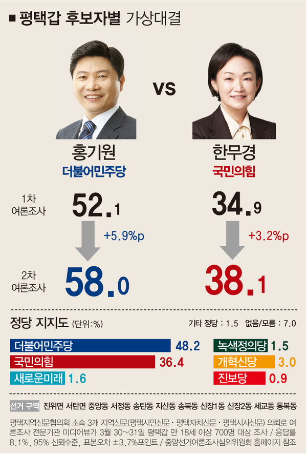 양자구도로 바뀐 평택(갑) 후보지지도는 민주당 홍기원 후보가 58.0%의 지지를 얻어 38.1%에 그친 국민의힘 한무경 후보를 19.9%p 앞섰다(무응답 : 3.9%) 1차 조사 대비 홍기원 후보는 5.9%p, 한무경 후보는 3.2%p 동반 상승한 가운데 격차가 더 벌어졌다.