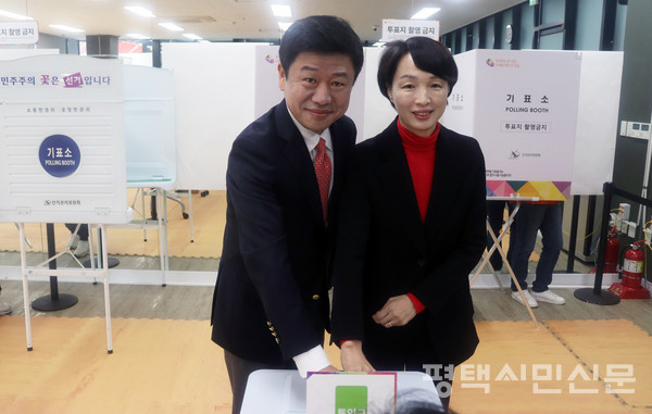 평택시병에 출마한 유의동 국민의힘 후보와 배우자 김윤정씨가 제22대 국회의원선거 사전투표일인 4월 5일 오전 용이동행정복지센터에 마련된 사전투표소에서 투표하고 있다.