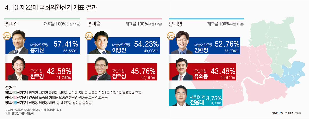 제22대 국회의원선거 평택지역 개표 결과 더불어민주당이 평택시갑·을·병 3개 선거구에서 홍기원·이병진·김현정 후보가 당선되는 압승을 거뒀다.