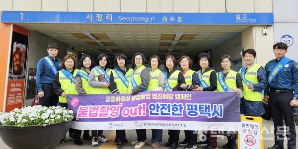 평택시는 4월 11일 평택시 불법 촬영 시민감시단과 평택경찰서가 공동으로 서정리역 일대에서 공중화장실 불법 촬영 예방 캠페인 활동을 펼쳤다고 12일 밝혔다.